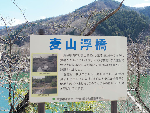 Read more奥多摩湖(小河内ダム)に2つある浮橋のうちの1つ。 公共交通機関でのアクセスは、奥多摩駅からバスで約30分弱の「小河内(おごうち)神社」からすぐ。 1時間に1本程度のバスなので、帰りの時間は必ずチェックするのが吉。 帰りはひとつ奥多摩駅寄りの駅(たぶん峰谷橋)から乗る方がバス停が広くおすすめ。小河内神社のバス停は細い歩道上にあるので、スレスレを行き交う車の往来が怖い。