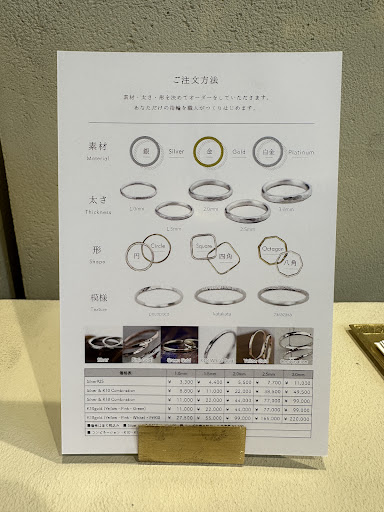 I stumbled across this store while on Google maps - just casually researching the area. My partner and I had been looking for a place to get wedding bands while on our trip in Japan and this place is a gem!!! They offer a workshop, where you can make your own rings (ready made options are also available). Pricing varies base on the material, finish and engravings.