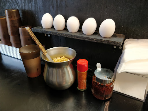 Raw eggs are waiting to be cracked into your bowl, and extra broth is available.
