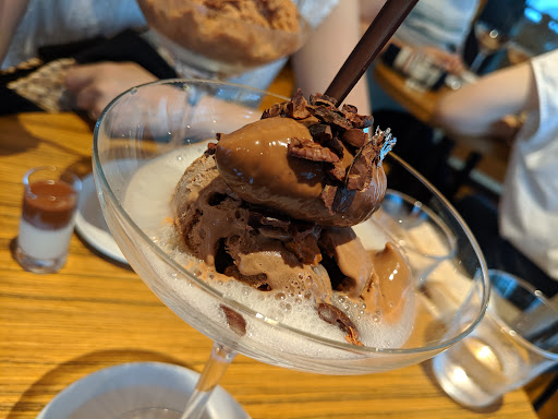 Came here after lunch for some sweets and decided to order their original chocolate parfait, a hot chocolate, and two pieces of chocolate. The parfait has different chocolate components where you can enjoy the different textures and varying intensity of dark chocolate flavors; the unique point is the lychee sauce which added a vibrant fruity taste. For the hot chocolate, there were three different cacao beans to choose from. I had the Haiti cacao which has a roasted nutty flavor; it was rich and tasty. The two chocolate pieces I had were the sansho (japanese pepper) and shiso (japanese basil) flavors; the sansho one was very tasty, flavor was pleasant without the numbing spice effect. As for the shiso chocolate, the flavor was very subtle, maybe because of all the chocolate I had already consumed. Also bought a chocolate flavored canelé and financier for takeout and they were nice, especially the financier. Overall a great place to enjoy some high quality dark chocolate sweets and drinks which were...