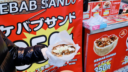 "Reis Kebab Shinjuku Kabukicho." When you think of kebabs in Shinjuku, this is the place that comes to mind. The bright red exterior stands out in Kabukicho, making it easy to spot. The Kebab Sandwich is priced at an incredibly reasonable 350 yen, making it a go-to spot for a quick bite. One of the best things is how fast the order comes out. This speed makes it especially convenient when you’re feeling a bit hungry late at night and need something fast.