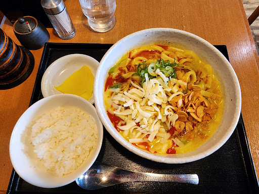 Read more美味しいと評判なのでお邪魔しました☺️武蔵小杉に用事があったので、埼玉から途中下車で寄らせてもらいました。昔、自由が丘マクドナルドでバイトしてましたが、街の雰囲気がかなり変わっていました💦店に入店した際に店員さんから二階を案内されました。オーダーするメニューが決まりましたが、二階席には店員を呼ぶ呼び出しボタンはありませんでしたが、しばらくすると店員さんが一階から階段を走って水を持ってきてくれました。店内も綺麗でわざわざ走ってきてくれた対応には好感が持てました。今回は辛吉カレーうどんの大盛を頼みましたが、自動的にライスと漬物がついており麺を食べ終わったら汁にライスを入れてくださいと配慮も伺えました。肝心のうどんですが、麺は噛みごたえのあるモチモチした麺で、また汁はスパイスの効いた美味しい汁に仕上がっていました。色々な店でカレーうどんを食べてますが、エスニックというか和風のカレーうどんにはない、奥行きのある美味しさに仕上がっており汁単独でも美味しいですが、麺を食べ終わった際にライスを入れたリゾット的な要素も良かったです。ここのカレーうどんは、忖度抜きで美味しかったです。また近くに寄った...