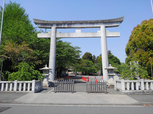 神社の前は道路はさみ公園は 牡丹園と古井戸古墳 噴水もある大きい公園で そちらのトイレは電気が点いて24時間使えます