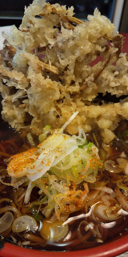天ぷらそば。 選べる天ぷらから「桜海老天」ネギ多め注文。 今日は天ぷら平置きスタイル、そそりたつスタイルとは違いますね。ネギ多めは熱々暗黒出汁に浸せて味わう。ランチには並ぶけど回転早い優良店。
