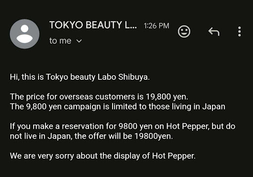 Read moreLooked up online for English speaking facials and found this location. Online on hot pepper, there was a first time customer deal for Hydrafacials for 9800 yen. Although you may book online, we went in person today and were explicitly told it would be 19,800 yen for us and only second time visitors would pay 9800 yen by the receptionist Emma. When we inquired it the first time, she said no, it was 19,800 yen. We asked a second time and showed the hot pepper website she looked surprised and said there was an error and that the website was wrong. We provided our email information and she said she would send us an update. Her email stated the deal is for locals only- never did she ask if we were...