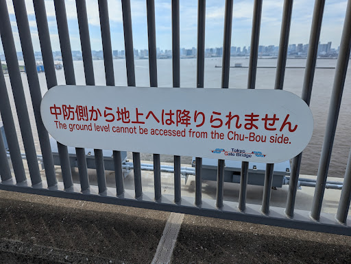 Read moreフフフ…行きなさるんかい…。 2024年6月現在、まだ歩行者用道路は通じておらんよ…「中防(ちゅうぼう)側から地上へは降りられません」だと…なんで「この先は行き止まり」って分かりやすく書いてくれないんだ…。 新木場駅からトコトコと歩いて行きましたが、これ多分バスで行く距離です。 有楽町線の車庫を見たり寄り道しましたが、2時間近くかかりました。 若洲公園(わかすこうえん)までバスはあります。 30分に一本くらいの時間帯もありますが、バスの方が早いです。 まあ世界に誇る建造物なので自分の足でと、タワーの昇降口はエレベーターで、しかもエアコンがあるので快適です。 でも9階の展望台はややダウトで、展望台は橋と反対側を眺める仕様です。 ありゃーと思いつつひとつ下がって8階から念願の東京ゲートブリッジに下り立ちます。 ゆ、揺れる!! 訪問日が風の強かったこと、自分がビビリであること、男性なので足の付け根に揺れ感知器が備わっていること、いろいろ要素はありますが、と、とにかく揺れる。 めちゃくちゃ怖かったです。 崩れると想像する訳ではないんです、船に乗っている感覚とも違うんです。 やっぱり相当な高さのあるところで足元がフラフラしてブラブラしている感知器が揺れる様は、キューーッとする怖さがありました。 でも、橋は渡りたいし、向こう側にも昇降タワーが見える、頑張れ自分と揺れる袋を押さえながら懸命に進みました。 なのになのになのに! 反対側のタワー昇降口には「関係者以外立入禁止」の掲示。 そ、そんなーー!!いや、確かに途中でいろいろ書いてあったけどさ、自分が悪いんだけどさ! いやー、失意の帰路でした。 行き止まりだよ、というのはネット情報で見ていたのですが、行き止まりってもっと大々的に告知するよねと思い込みがあり、失敗してしまいました。 これを見て下さったあなたが訪問するときは、どうぞ開通していることを強く、祈ります...