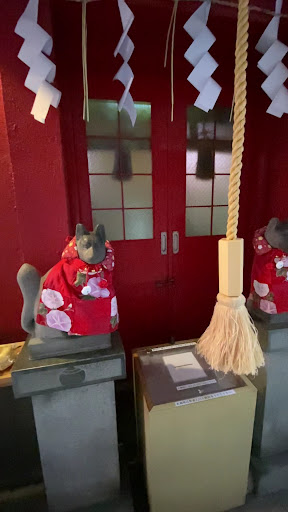 Commentary to accompany the photos: Across the street and a bit to the South West of the Yamaha Ginza building is Shiseido the Store (cosmetics). The horizontal arrow indicates the start of this exposition. The red star is the approximate location of the shrine and the vertical red arrow indicates the entrance from the alley behind the block. If you walk down the side street to the end of the Shiseido building, you will come upon a stone plinth next to a walkway. The plinth reads 豊岩稲荷神社 Toyoiwa Inari {fox] Shrine. The walkway between the buildings is clean but quickly becomes dark and foreboding. I raise the Phial of Galadriel (turn on the flash on my camera) and proceed cautiously with and eye for giant spiders. An abrupt right turn causes me to look back longingly at the sunlight before I bravely proceed. A left turn leads to a slightly wider passage (with a parked bicycle). A final left to discover the cramped precincts of the shrine. The poor guardian foxes are covered in COVID hand grease from worshipers unable to resist pawing the statues in the confined space. This picture from July 2023. By January 2024, the foxes were sporting vermilion bibs with an appliqué along the lower hem. The shrine's name plate. A bell to attract the attention of the gods. A donors' registry. Pretty good repair of a muzzle fracture. A line of lanterns 'light' the way to the shrine from the alley entrance. without flash From the alleyway, a dark and foreboding opening. The entrance off the alley is a little more obviously a Shinto shrine. The nobori (flags) proudly...