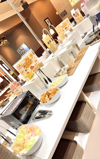 [デザート]ソフトクリーム,綿菓子以外に一口サイズのいろんなケーキやゼリー,みたらし団子が置いてあった。別日はまた違うデザートが用意されているかもしれない。