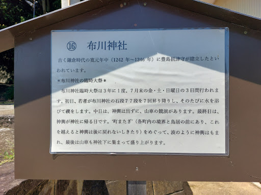 Read more御祭神:久久能智之命、配祀神:水波能女命、久那斗神、市杵島姫命 鎌倉時代の寛元年中(1243年~1247年)、豊島摂津守の建立と伝えられます。江戸時代は布川大明神と呼ばれていましたが、明治元年(1868年)に布川神社と改称しました。 つく舞発祥の地として知られている神社、明治42年(1909年)まで開催されてました。 階段を上がり境内につくと明るい雰囲気です、車は境内入口前に駐...
