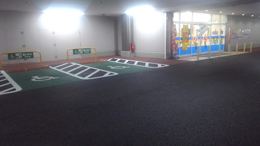 吹き抜けの1階が駐車場と入口 悪天候の日も天候を気にせず入店できます 入口に入るとエスカレーター(奥にエレベーターも有) ヤマダ電機と似たような作り