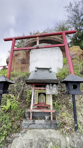 Located at the botton of the Mount Tsukuba Ropeway/at the Tsutsujigaoka Bus Stop is the ガマ(蟇)大明神 Gama Daimyojin, a Shinto shrine celebrating the toad imagery of the twin peaked Tsukuba Mountain. The large toad above (on the hill side) is a modified natural outcrop. There is a torii in front of the toad as well as a small shrine sanctuary. The sign on the shrine is too weathered to read.