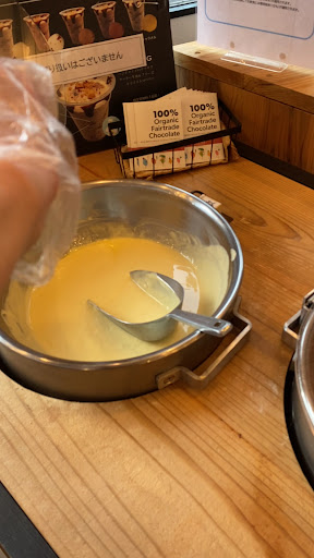 Read more以前こちらのオランジェ等をいただきとても美味しかったので機会があればお邪魔したいと思っておりました 今日はインスタで拝見したアイスバー目当てで伺いました 店内は贈答用に最適な箱詰めされた美味しそうなチョコレート菓子が豊富に揃っております勿論自宅用にも単品で購入出来るチョコレート菓子も沢山あります 商品を作っている姿などもガラス越しに拝見できました 通りに面した場所にはイートインスペースもあります お目当てのアイスバーを選びそのアイスにかけるチョコソースも選び支払いを済ませます すると店員さんがアイスバーを持ってきてくれ チョコソースを自分でかけられますとても楽しい経験で美味しくいただきました