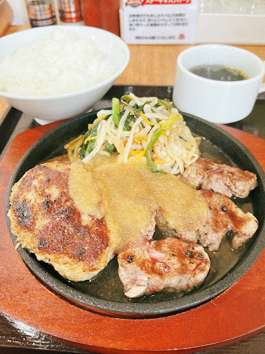 ソースはさっぱりだけど、薄味、付け合わせのもやしから水出てくるので中盤からは鉄板がバシャバシャで余計に薄くなり物足りない、県民生か見た目から宮のたれ連想しがちだから、もう少し濃くつくって、なにかすりおろしに加えるとかしてパンチが個人的に欲しい。 それか卓上にニンニク、醤油あたり置いてといてご自由に〜とか、ありますよ〜みたいなシート置いといて必要な人にあげるとか、
