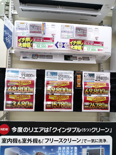 予算が取れずにエアコンは1台と我慢していましたが暑すぎて息が上がりヤマダ電機に行ってみたら、生方さんが又お買い得情報を紹介してくださり念願叶い契約したら明日工事に来てくださることになり凄く嬉しかったです。明日からびしよびしよにならずにお勝手ができます。ヤマダ電機万歳🙌です。😊💯 今朝、工事に若い礼儀正しい2人が来てくださり手際よくエアコンの取り付けをしてくださり、キッチンが暑くてと言ったら扇風機の位地を教えてくれて私の部屋とキッチンも涼しくていい感じ。長生きできます。笑✌👍💯🙌
