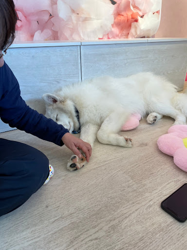 初めてのサモエドちゃん達とのモフモフ体験🥰 触らせてもらえるのか、ワンちゃん達と遊べるのか、ドキドキと、ワクワクが入り混じった気持ちでお店に入りました。 注意事項など、詳しくそしてわかりやすく説明してもらった事で、ドキドキは減ってワクワク感いっぱいでサモエドブースに入室しました🤩 サモエドちゃん3頭、すぐに寄ってきてくれてフワッ。うわ〜。これがモフモフ。ほんとにふわっふわ。 お名前教えてもらったけど、すぐには覚えられなくて、でも、お名前の書いてある写真も貼ってあったので、時々見ながら名前呼んで触れ合えました。 3頭とも、ちょっと毛並みが違うけど、ふわふわに触れるたびに、癒されました〜(#^^#) 慣れてくると、ゴロンと横になってくれて、 隣に一緒にゴロンとワンちゃん枕🤩 しあわせすぎる〜🤤🤤🤤 これは、体験しないとわからない〜😘😘 モフモフに顔をうずめると、ほんのりシャンプーのいい匂い。たまら〜ん🤤 可愛くて可愛くて離れたくなくなること請け合いです。 まだ幼いコニーちゃんは、短い時間での触れ合いだったけれど、今だけの猿期って言うことで、お顔がめっちゃかわいい。抱っこ出来る貴重な時期を堪能出来て、お得感マシマシでした。サモエドちゃ...