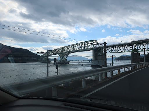 Read more山口県南東部にある本州と屋代島(周防大島)を結ぶ1,020mの橋です。1976年7月に有料道路として開通しましたが20年後に無料開放されました。 鋼鉄製のトラス橋で、武骨な感じがとても良い橋です。海峡中央部はトラス部材が道路の上にあり、両端は道路の下にトラス部材が設置されています。 国道437号になっており片側1車線で歩道も片方にあります。本州側はJR山陽本線と立体交差しているので、橋上から写真をとっている方がおられました。 橋の下の海峡は大畠瀬戸と呼ばれるかなり潮の流れが速いところで、橋の上からでも流れの速さが見て取れます。 大島へ渡り交差点を左折後200m弱のところにある無料駐車場に車を停めて、じっくり展望しました。