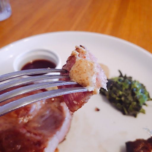 ポークステーキと同じお皿に、スピナッチのソテーとマッシュポテトも添えられてますが、そちらも美味しい✨もう少し量が乗ってたら、星1つ増やして5つにしてました笑