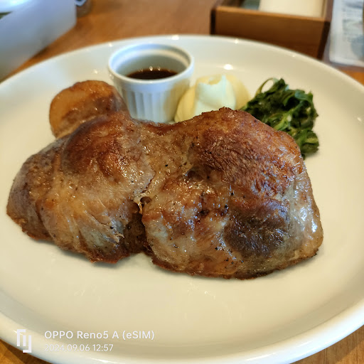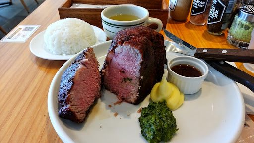その後5分位でメインのポークステーキとライスが来ました。ポークステーキは、中がピンク色で、肉汁が出てきてジューシーでした。塩味がついてるので、まずはそのまま食べると、お肉の味もしっかり味わえます。外は焼き目がついて香ばしく、とても美味しいです!