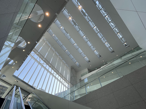 1階に出店しているQBハウス 横浜市役所店。通常店舗よりも落ち着いた色合いになっている。 新庁舎は再開発の進む北仲通地区に所在し、南から西にかけては、古くから栄えてきた関内、野毛といった地区につながる一方で、運河を挟んだ北側には1980年代以降に開発されたみなとみらい21 (MM21) 地区が広がる[4]。そうした横浜を代表する各地区の結節点に位置するため、市では市役所を市民や街に開き、にぎわいを呼び込む空間にしようと、地上1階から3階までの低層部には商業施設やアトリウムを設け、日曜などの閉庁日も開放している[18]。1、2階の商業施設「ラクシス...