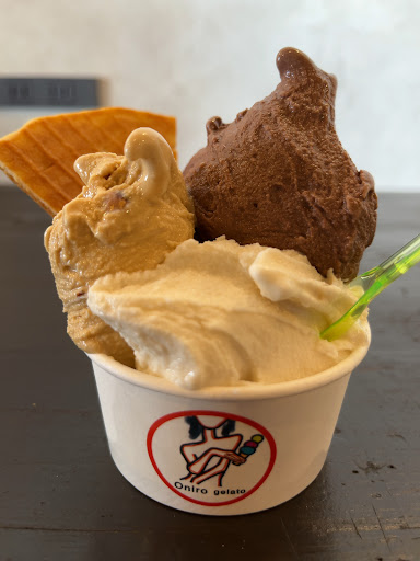 先日、テレビで紹介されていた古民家を改装したジェラート店に娘と一緒に訪れました。ダブルからの販売で、私は喜太郎柿のソルベと焦がしキャラメルナッツ、娘は大山さん恵ミルクとOniroカカオを選びました。