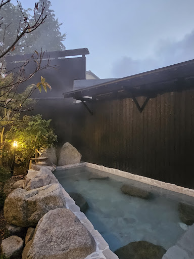 This ryokan has 10 rooms and appears to be quite popular with Korean tourists. It is on the larger side of ryokans and therefore has two public onsen baths (one woman and one men) - each with an indoor and an outdoor soaking area. There is also two private baths available for a 50 min reservation slot - once per day, per room.