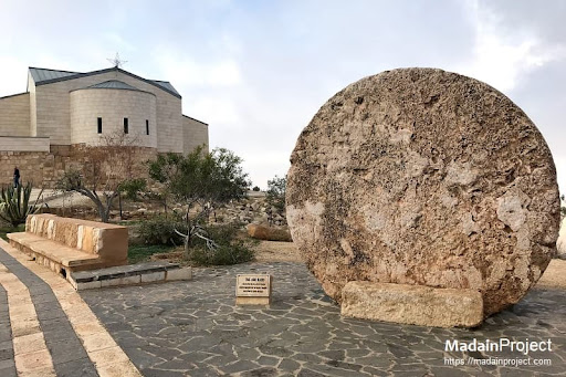 The rolling stone used as a fortified door of a Byzantine monastery in the old village of Faisaliyah, once known as Kufr Abu Badd. The south-eastern rear facade of the modern memorial church of Moses over mount Nebo is also visible...