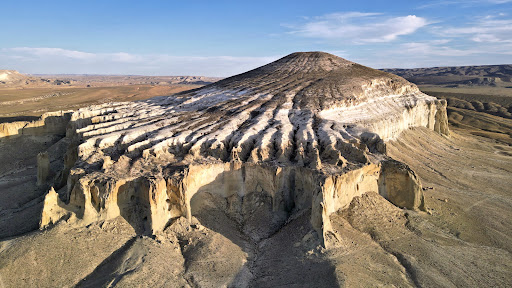 Read moreUn altro notevole e interessante luogo del deserto del Mangystau. Una alta formazione rocciosa che appare isolata rispetto alla pianura circostante. Evidenti i fenomeni di erosione specie su un lato dove sono presenti alte e lisce pareti verticali con guglie e picchi. Anche in questo massiccio è evidente la sedimentazione di diversi strati di materiali che si sono accumulati nel corso del tempo, il che porta ad una bella varietà cromatica come se fosse una...