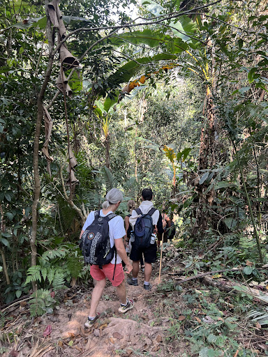 On the second day, we woke up early for a 14 km hike through the jungle. One of the biggest challenges was reaching water sources. The mountain peaks were interconnected and would have been impossible to navigate without Thong. We kept a steady pace, moving from point A to B. Along the way, we saw many butterflies, a pig-tailed monkey, and squirrels. After the long hike, we enjoyed the sunset at one of the most beautiful spots I’ve ever seen. That night, we slept in bamboo huts and ate food we’d foraged from the jungle—mushrooms, banana flowers, and edible plant leaves.