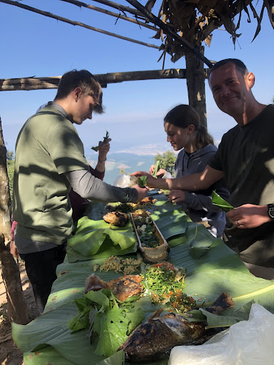 After a drive to the starting point, we began hiking with Thong, a local guide who knew the area inside out. He led us to a high point with stunning jungle views. That evening, we used banana leaves and bamboo sticks to make tents, embracing nature to its fullest.