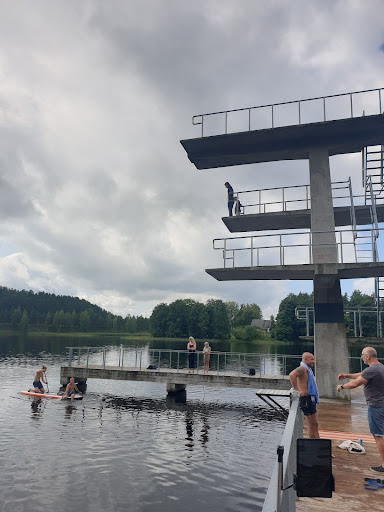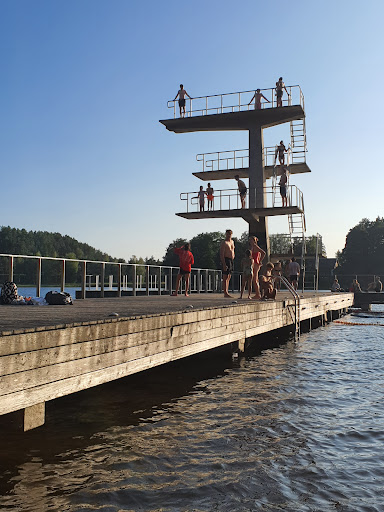 Прекрасное место чтобы приехать на целый день в тёплое летнее время. Единственное место в Литве, где организован бассейн на открытой воде, отделен от основного водоема мостками, на которых есть лестницы для спуска в воду, внутри растянуты дорожки, длина примерно метров 30. Также есть вышка для прыжков в воду, выполнена из бетона , выглядит очень надежно, высота площадок для ныряния примерно 3, 5, 7 метров. Пляж организован террассами: у самой воды можно загорать на деревянном настиле, далее песчаная зона, и повыше можно расположиться на траве, а также найти место в тени под соснами. Есть небольшое кафе, детская площадка, кабинки для переодевания. Если не хотите 🏊♂️ непосредственно в бассейне, рядом есть обычный плавный песчаный заход в воду, не очень широкий, но с малышами поплескаться достаточно. Если это место не понравится, пожно в течение 7 минут на машине проехать через городок на соседнее озеро, там также чудесный пляж, надувной городок на воде, на берегу работал надувной детской аквапарк( думаю платный). Рядом место для занятий вейкбордингом: натянуты канаты и установлены трамплины в воде. Были там в...