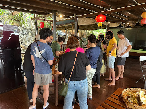 Read moreTaking a short stay in a durian farm to get some tranquility and peace was what many would hope for and definitely hoping to catch some good durian harvest has to really depend on the Almighty GOD. BUT we have also to think that who are the guests that will be residing with you in that compound in that limited rooms for the entire stay. That will contribute to entire trip score. Unfortunately, I would say, we encountered a group of Chinese from China. As you know culture is a big difference, especially when you are confronted with challenges during mealtime. As you can see from the pictures, the owner can't contain them to be seated at their table. In fact, each table are placed a basket which indicate your share of durian will be distributed to you. But no, this group of people swam right to the table and crowd around. Talking loudly and asking questions and questions how to identify the durian. I know learning is good, but it makes you tickle when they still asked the owner what breed of durian after a good close of an hour learning. There's probably only 4 kinds of durian in display. To make things worse, when the owner started to open up the durian. It was not well distributed, we were faced with challenges, and we had to rolled up our sleeves and join the "fight". My friends and I wasn't ready for such food snatching action. We weren't brought up this way and we had never face a situation like this before. But we know we are being cornered to a state that no snatch, no durian. And these people continue to crowd around the table leaving no space and gaps for others. It is quite disappointing to find ourselves behaving in such manner. A big contrast from the first objective to seek tranquility and peace to stay in a durian farm, devouring the best durian harvesting enjoying the view. I hope to forget how we forced to stand, snatch and aiming for fresh open durian. That was really lousy and ugly. I did convey my concern to the younger boss and he was quite understanding about the culture shock we are experiencing. He was nice to accept my proposal to separate our dinner from theirs. For I just want to enjoy a peaceful dinner without having to snatch over a dinner.