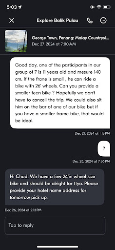 I am sure their tour is great but we were never able to experience it as they cancelled us the night before. In the days before the event, they were not responsive to my question taking too long to awnser their messages. Then the day before the activity, they woke up and messaged me at 2pm. I awnsered back at 7pm as we were out exploring all day as tourists do (no wifi) and asked if I could reduce the reservation by one guess as my wife was not feeling good (we are a familly of 7). At 8h52 pm, they said No and offered to rebook us another day. At 09h01 PM they cancelled the activity for the ENTIRE group leaving us with no time to plan anything else, and mostly loosing a day. I had no chance to even reply to their messages Very frustrating for our familly. We came from far away and were looking forward to the activity. For me that was not professional of them. I am sure we would have loved the experience but their customer service was not acceptable unfortunatly. Pictures below. Look at the time of their replies. To their credit, at least they did refund us our money.