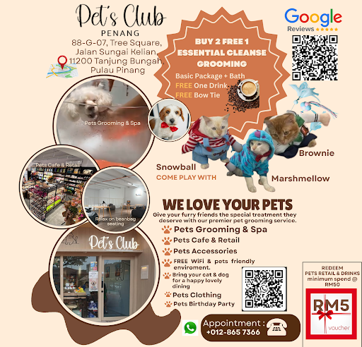 The Tree Square is a great spot and parking convenient especially for those pets lovers to visit Pets Club Penang located just opposite the parking of Uniqlo. Beside Rose Thai Restaurant or name it just the neighbor of Zus Coffee, or Coffee Bean. If you just wanna chill with your dogs, cats especially if you just wanna hang out your time with your lovely pets and have a tea time coffee, tea or dining for your dog at Pets Club Penang; a pets friendly environment cafe, retail and cat & dog grooming (BUY 2 FREE 1 PROMOTION AVAILABLE NOW) a pets friendly space with FREE WiFi to be a chill spot of students and adults living nearby, away from the busy city and come play with our in-house cat Brownie, Snowball and Marshmallow. See you...