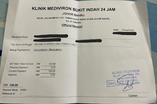 However, after the consultation — even after I cancelled the cough medication — I was charged a total of RM 120. I’m not sure what the total would have been before the cancellation, but I found the final amount unexpectedly high.