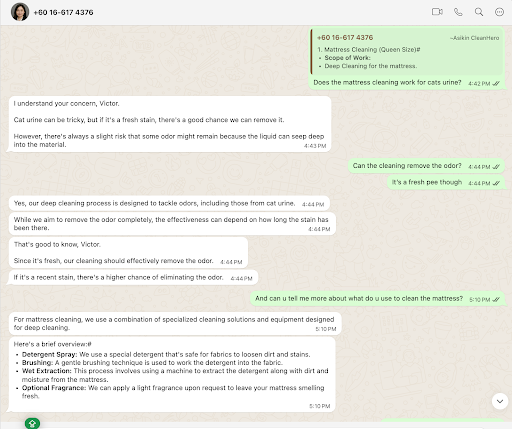 Was generally pleased with their services. They replied to my queries promptly. Arrived on time (earlier in fact which was good for me)....brought the right equipment and tools i.e vaccum accessories so they can suck out all that dirt at nooks and corners of the sofa and a load of chemicals. They even left us with appropriate instruction after they finished work.