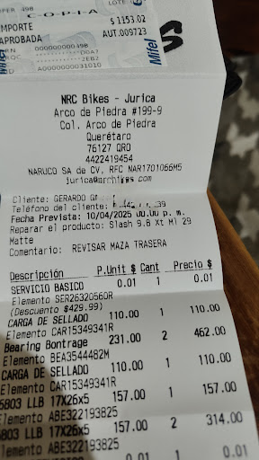 El Sr. José de NRC Bikes se puso en contacto conmigo, pregunto por mi inconformidad, me dijo que lo revisarían y entro en garantía; ofrecío pagar lo que cobraron, le comenté que no era mi interés el reembolso pero agradecí su atención y el demostrar que les interesa su negocio, finalmente me dijo que dejaba un bono abierto. Llegó el segundo servicio de la Bicicleta, opte por volver a NRC, me atendieron muy bien, me reportaron los detalles en la bicicleta, los cuales cubrió la garantía, adicionalmente ocupe un aceite y me dijeron que lo descontaron del bono que me dieron a cuenta. En general se mejoro mi experiencia, creo que es importante hacer lo que toca como cliente y a NRC lo correspondiente como proveedor de productos...
