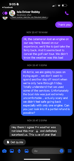 They did offer to take us out another time, however, the overall experience did not leave a good taste in our mouth. We understand that services were rendered and didnât ask for a full refund, just SOMETHING back due to not getting the golf cart tour and the poor experience on the catamaran + the additional money that we spent on the ferry to return in a safer manner. After all, we couldâve paid in cash/pesos at the time of the services vs ahead of time via PayPal. A partial refund was granted, which I absolutely appreciated, however, 2 weeks have gone by and nothing has been done. If youâre not going to refund anything, just say that. Iâm glad others have had great experiences, maybe we just got unlucky but I definitely wish I wouldâve spent more time researching the...
