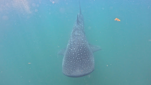 As we see one of the humongous sharks heading right for the boat, our guide Iván yells "jump over board.... NOW" !! Boom my wife and I hit the water and turn around and look straight into the gaping mouth of a HUGE, "beautiful" Whale Shark, less than six feet away and like a bus, was coming straight at us. Quickly we move to the side as it gently swims passed us without a care in the world, we kick hard to keep up, all the while Iván is taking pics and videos of us with the shark with his GoPro. The pics and video footage was a complementary part of the tour and is something we will cherish for ever....thank you Iván!!!