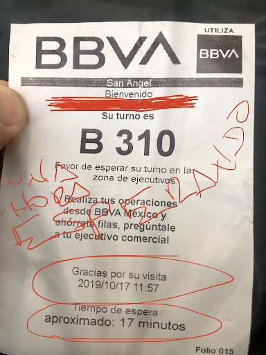 Read moreNi una estrella se merecen pero sino no puedo dejar mi queja, espere más de 40 min.y no logré que me atendieran, tome mi turno y espere, pero comenzaron a pasar gente que iba llegando y sin turno (5 personas), los pasan antes que a uno, me queje y me dijeron que es porque tienen "cita" lo cual es mentira, en fin que al final le pregunté a una tipeja con quién podía poner mi queja y me dijo: Dígame, le expliqué y después me preguntó que trámite haría le dije que hacerca de un estado de cuenta y adivinen jajajaja me dijo que los ejecutivos no resuelven dudas acerca de estados de cuenta que solo me comunican y me lo resuelve alguien más o por teléfono que yo marque, total que me salí sin mi trámite y demasiado molesta, de verdad ni vayan, solo...