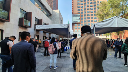 Realizas una primer fila, que en ocasiones puede dar la vuelta a la manzana hasta llegar a la entrada principal, al ingresar al patio principal podríamos señalarlo como un segundo filtro y la fila se realiza en zigzag en los espacios marcados en el piso para sana distancia.