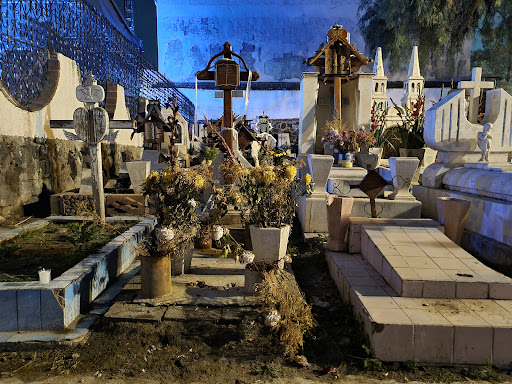 El panteón está lleno de veladoras y es un lugar predilecto para hacer fotografía nocturna. Tuve la oportunidad de ver una carpa con música típica de la fecha, bastante agradable.