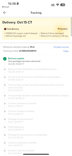 Read morePésima empresa de paquetería, fui a preguntar sobre un paquete a esta oficina y me dijeron no lo tenían ahí que se lo entregaron a otra paquetería llamada SCM mensajería y paquetería (aparentemente esta mensajería está ayudando a Quality Post a entregar o almacenar los paquetes, no lo sé), cuando llame a la paquetería para rastrear mi envió me dijeron que no podían rastrearlo ya que el numero de rastreo que maneja SCM es numérico y que tenia que preguntarle a quality post sobre mi paquete. En pocas palabras NO SABEN DONDE ESTA MI PAQUETE. Lo peor es que ponen estados de envío en su página FALSOS, por ejemplo, que visitaron el domicilio y no encontraron alguien que pudiera recibir el paquete, o que ya lo entregaron, y esto hace que automáticamente pierdas la posibilidad de hacer reclamo en la página de AliExpress por que la tienda considera como evidencia los estados de envío. Si Quality Post fuera una empresa honesta y por lo menos colocara estados de envío REALES los clientes que compramos productos de esta página (AliExpress) podríamos hacer el reclamo y recuperar, aunque sea parte del dinero. Como consejo si esto ayuda a alguien eviten el envío de aliexpress standard shipping. Desconozco si los métodos de envío de china post registered air mail y epacket los sigue entregando correos de México parece que sí. Saludos a todos y espero que esta empresa ya no siga afectando a...