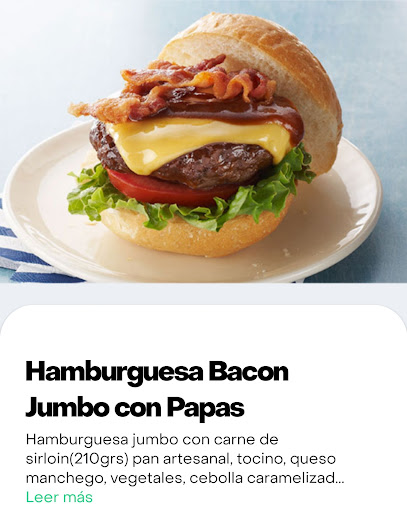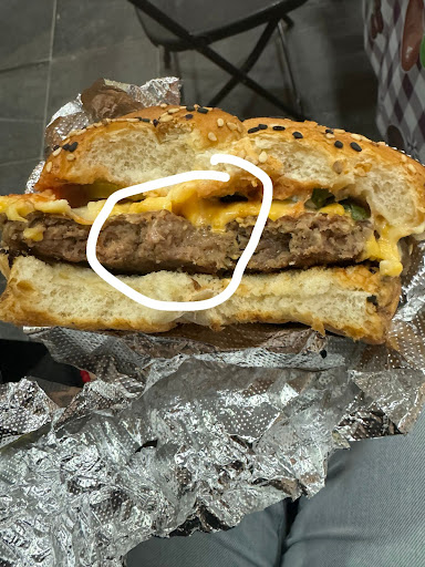 El pan artesanal resulta ser el mismo de la tienda, el tocino no es natural, es el embutido más barato que encontraron, los 210gr de Sirloin resultan ser 90gr de una carne para hamburguesa congelada, de la cebolla caramelizada no puedo opinar por qué simplemente no venía en la hamburguesa, de los vegetales la foto habla por si mismo.