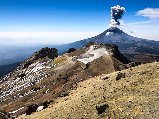 Popocatépetl is located 70 km southeast of Capital of Mexico, the Mexico City. Ciudad de México or Maxico City, is located in the Valley of Mexico and is the oldest capital in the Americas, first built by the Aztecs in 1325, known at the time as Tenochtitlan. Popocatépetl means"smokey mountain" in the indigenous Náhuatl language and is an active stratovolcano. All is well when it is calm and Beautiful. To watch the volcanic eruption from far far away is enthralling. Still volcanoes are Volcanoes and when they erupt and bring destruction God knows. Safety...