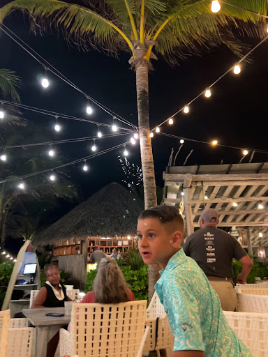 The best part about this place is the ambience you have some tables that are covered and in more of a restaurant setting and then just 100 or 200 feet away you have tables and other seating options in the sand near the beach with lights hanging above you and the ocean breeze Keeping you nice and cool in the evenings.
