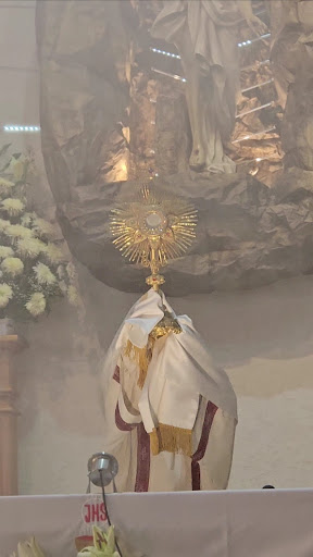 Read moreEstando en misa observé que en la corona de la Virgen estaba emanando una luz verde dirijida a la cruz de Jesús... en ese momento me dice en voz baja Elisa, ...mi esposa.. "Ya viste la Luz verde que sale de su corona?" Después de que tome la foto vi un círculo envolviendo a la cruz ... E inicia la misa y...