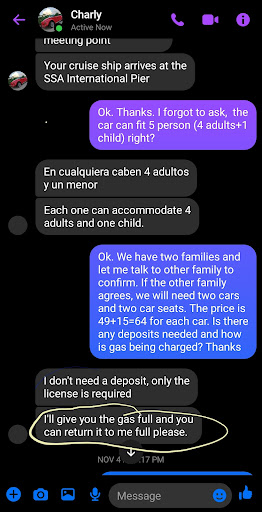 I recently rented two cars from a person named Charly Lopez, who posted car rental information in a Facebook group (see attached picture). The initial communication went smoothly, and I knew that gas costs would be part of the rental agreement. However, since I had never rented cars in Mexico before, I asked Charly about the gas return process. He told me, āIāll give you the gas full and you can return it full, please.ā Based on this, I assumed the cars would be given with a full tank, and Iād return them with a full tank.