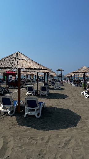 A perfect spot for families. The beach offers a large, shady parking area and a well-maintained sandy shore. The beach is divided into three sections based on the type of sunbathing options available. There's a spacious area with sunbeds and umbrellas, and two smaller sections featuring hammock beds with sun sails and reed-covered huts. The huts provide the best shade and cost around €12-30, similar to the hammock beds.
