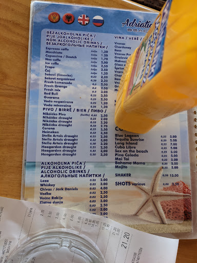 Read moreДанас смо први пут посетили овај део Велике плаже. Иначе, већ неколико година летујемо у Улцињу и веома смо задовољни и плажом и гостопримством мештана. Што се тиче плаже: деца су просто срећна када су на њој,ситан песак,дугачак плићак,мали таласи...по мени,идеално место за мању децу..За нас је мало ,,смор,,што није дубље али је сам поглед и доживљај на плажи одличан. Не могу а да не похвалим ресторан AdriaticaBeach . Веома пријатно изненађење. Два млада конобара која обслужују не малу салу,без тензије,са осмехом,веома професионалним приступом,дајући гостима простора да уживају у храни и пићу. Што се хране тиче,порције добре,топле,кратко време чекања. Ћевапи су баш онакви какви и требају бити, помфрит врућ и светле боје,шопска салата одлична. Супруга је узела чиз-бургер и појела са великим задовољством а деци смо наручили пасту карбонара по пола порције и буквално су омазали тањире... Ово коментаришем из великог задовољства као дугогодишњи угоститељ и веома ми је драго када видим колеге које раде свој посао онако како треба... Бравооо, Ето нас...