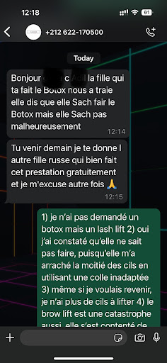 Selon leur propre admission comme le montre la conversation WhatsApp ci dessous, cette fille ne savait pas faire le lash lift et j’ai donc dû en faire les frais. En plus de l’incompétence des personnes dans ce salon sachez que chacune des femmes qui y travaille parle uniquement russe. Il y a une homme qui est sensé être traducteur, mais oubliez le fait de communiquer avec la personne qui manipule votre visage ou vos yeux. Je ne comprends pas les bonnes notes données à ce salon par les autres personnes alors qu’on peut en répartir amochée par leur faute. Évidemment j’ai...
